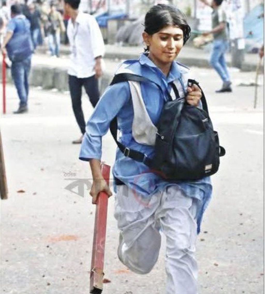 Ohidul Islan,Picture describedঃ Picture 1: A schoolgirl in uniform running just after completing a protest against Awami League, Chattra League, and their subordinate police in the New Market – Dhaka College area during the Monsoon Revolution Bangladesh 2024. She held a metal bar in one hand and her school bag in the other.