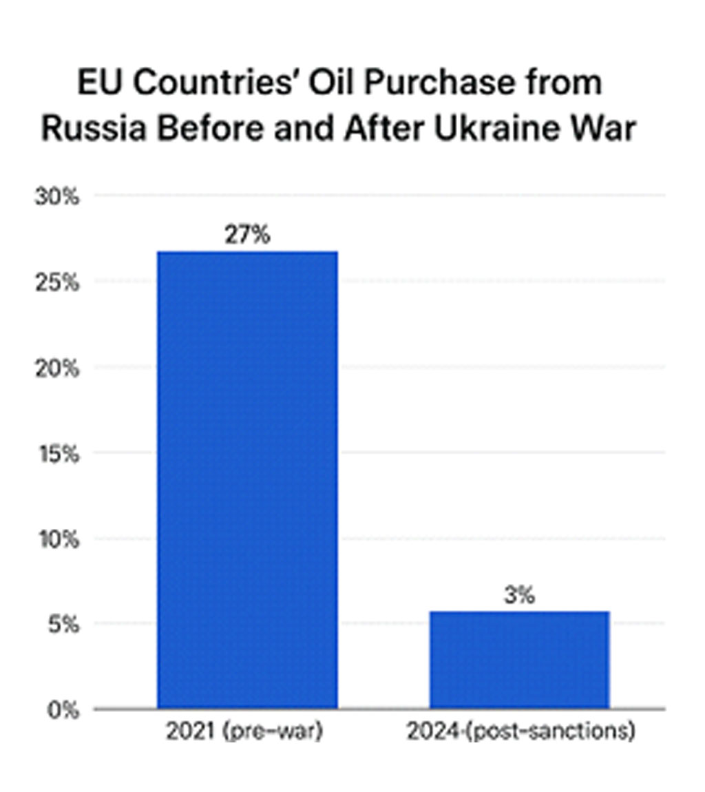 Indian social media often justifies India’s large purchases of Russian oil by citing the fact that EU countries still buy from Russia. However, the chart clearly shows that this claim is misleading. The EU’s oil imports from Russia have fallen to around 3% in 2024, compared to the levels before the war.